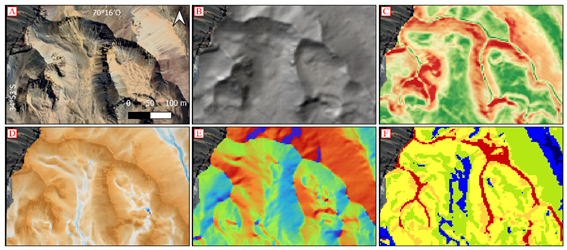 Figura 8. Morfometría de geoformas glaciares y periglaciares. A) Imagen de Google Earth Pro, B) Mapa de sombras, C) Pendientes, D) ITH, E) Orientación de laderas y F) Geomorphons.