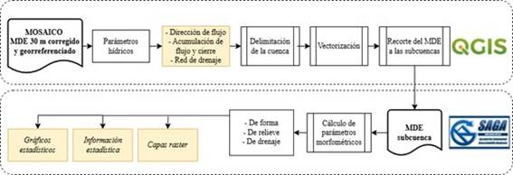 Figura 2. Diagrama de flujo de la metodología empleada para la obtención de parámetros morfométricos y mapas temáticos.