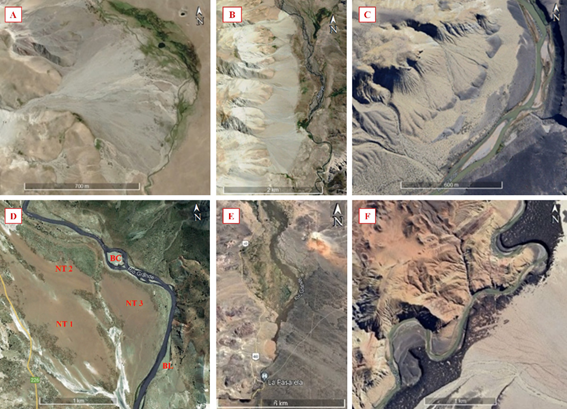 Con relación a geoformas fluviales y aluviales, se utilizaron como referencia los trabajos de Gutiérrez Elorza (2008) y Robertson, Jaramillo y Castiblanco (2013), adaptando las clasificaciones según Espósito, Moreiras, y Correas-González (2023). Se identificaron conos y abanicos aluviales, terrazas, meandros, drenaje entrelazado y barras de arena centrales y laterales (Figura 4 A-F).